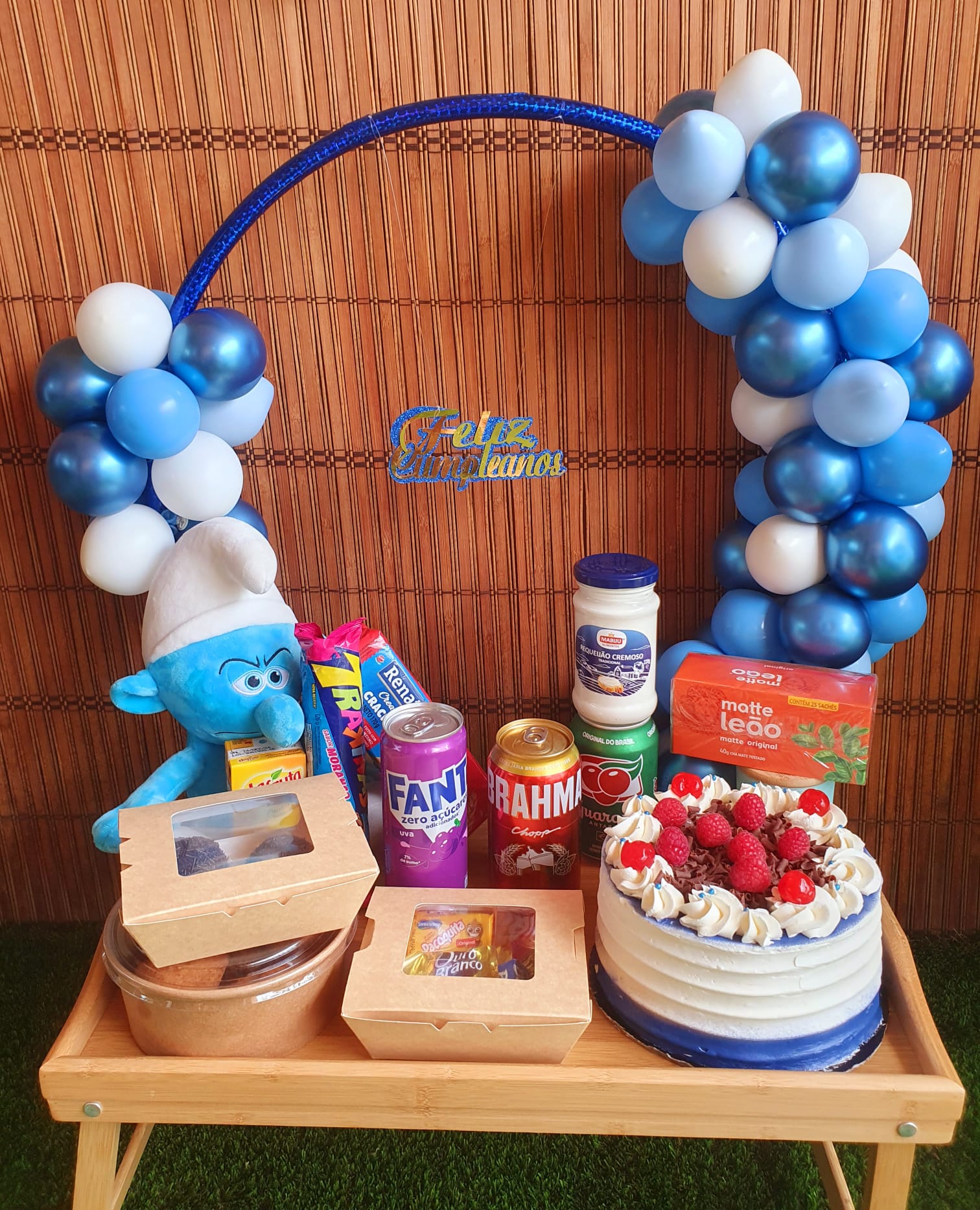 Tarta de 1 sabor Salgados variados Brigadeiros Ursinho Bolacha doce recheada Bolacha salgada Chá mate leão Velinha Surtidos de docinhos Guaraná antarctica Suco de Maracujá Cerveja Brahma Fanta uva Requeijão
